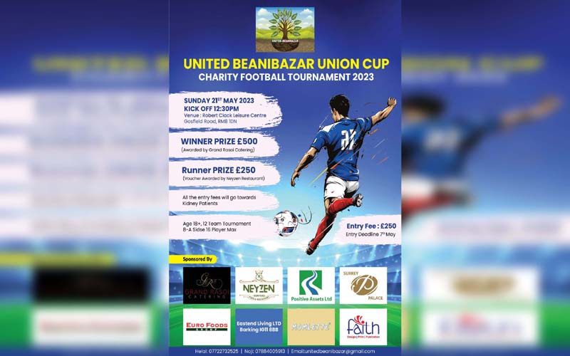 ইউনাইডেট বিয়ানীবাজার কমিউনিউটি এসোসিয়েশন এবারও কিডনী রোগীদের পাশে দাঁড়ানোর উদ্যোগ নিয়েছে।এজন্য ২১ মে আয়োজন করা হয়েছে ফুটবল টুর্নামেন্ট। এই টুর্নামেন্টে স্পন্সর করছে- গ্র্যান্ড রেসই কেটারিং, নেইজিন রেস্টুরেন্ট, পজেটিভ এসেট লিমিটেড, সারে দ্যা প্যালেস, ইউরো ফুড্স, ইষ্ট এন্ড লিভিং লিমিটেড, মামলেট, ফেইথ ডিজাইন এন্ড পাবলিকেশন্স।